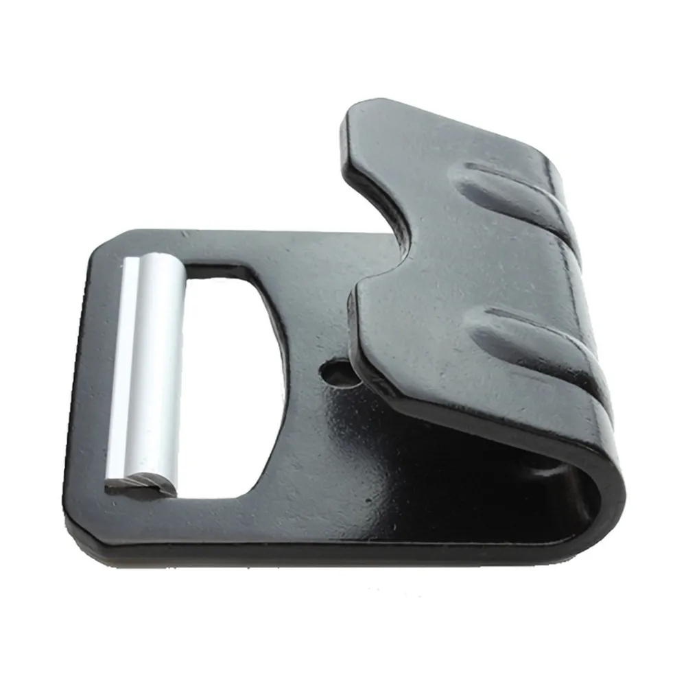 The 1021 flat hook has a black powder coat finish that helps prevent corrosion. Used in heavy-duty strap applications.