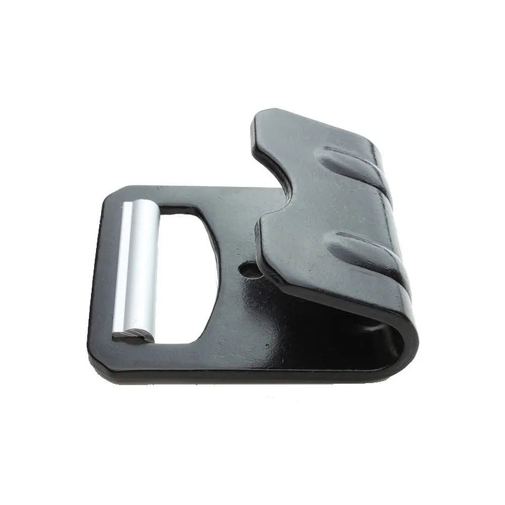 The 1021HD flat hook has a black powder coat finish that helps prevent corrosion and an aluminum defender in the webbing slot to protect the webbing from wear and abrasions. Used in heavy-duty strap applications.