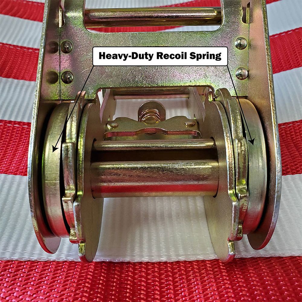 The self-tensioning ratchet has two heavy-duty recoil springs inside the mandrel (see photo below). As tension is applied to the ratchet, the springs are engaged. The springs are then ready if tension is lost due to a load shift. The spring takes up the lost tension, up to approximately 2 inches. This helps to ensure the end fittings of the strap assembly stay attached and secure.