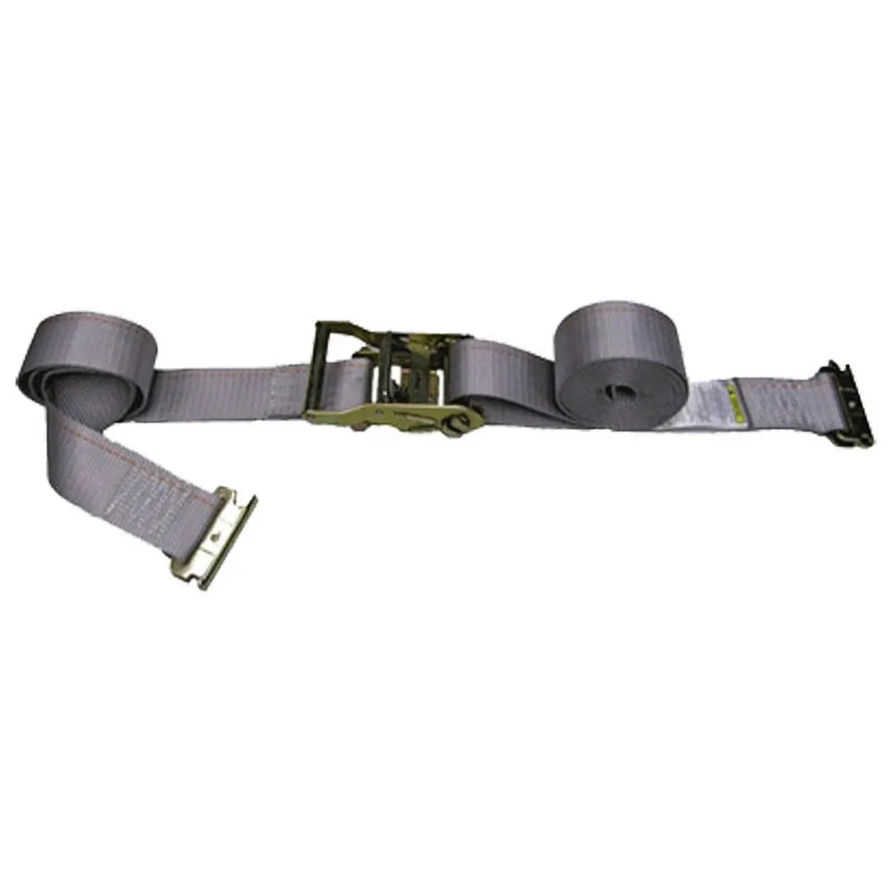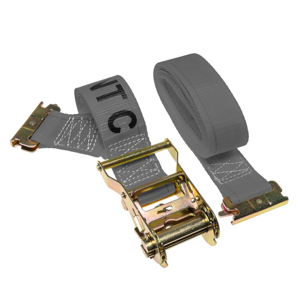 This 16' gray E-track ratchet strap features 2" wide polyster webbing and a 48" fixed end.