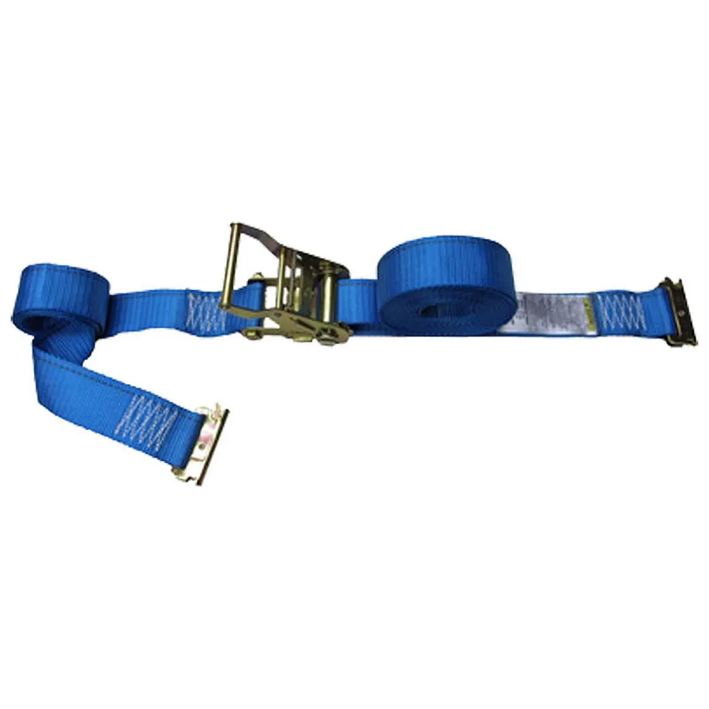 This 20' blue E-track ratchet strap features 2" wide polyster webbing and a 48" fixed end.