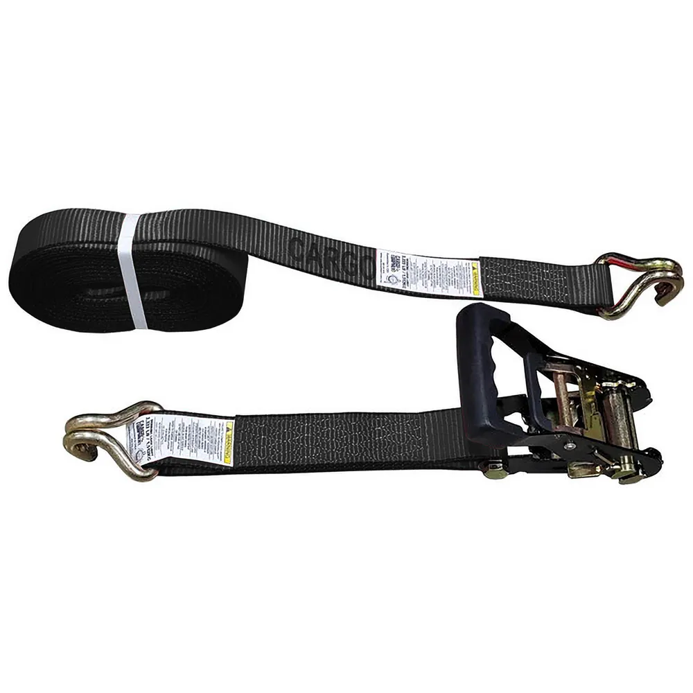 Heavy-duty 2" ratchet tie down straps using our ergonomic black rubber handle ratchet. Strength, comfort, and durability all in one easy-to-use ratchet strap. Strap assembly has a standard 12" fixed end. If you need a custom size not shown here, contact us. These straps are made to order in the USA! This 2" ratchet has a solid, one-piece steel handle with an ergonomic, soft black rubber grip molded to the metal. This ratchet features the same durability and great quality as the standard 804 ratchet but is easier on your hands! 2" Flat hooks on both ends. These heavy-duty flat hooks have a black powder coat finish to help prevent corrosion. Working Load Limit is 3,333 lbs., Break Strength is 10,000 lbs. We can make your ratchet strap in whatever length you need. This also includes the fixed end (ratchet end). Standard length is 12 inches, but we can make this shorter or longer.