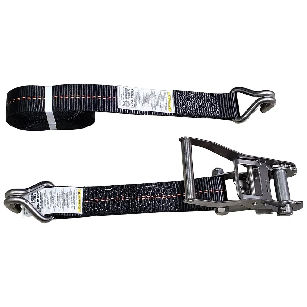 2" stainless steel ratchet strap features our heavy-duty 803SS stainless steel ratchet and 1006SS stainless steel wire hooks. This ratchet strap is made to order in the USA to whatever color and length you need. Call us if you need a length not listed here. Straps have a standard fixed end of 12 inches. This can also be customized upon request. Working Load Limit: 2,200 lbs Break Strength: 6,600 lbs