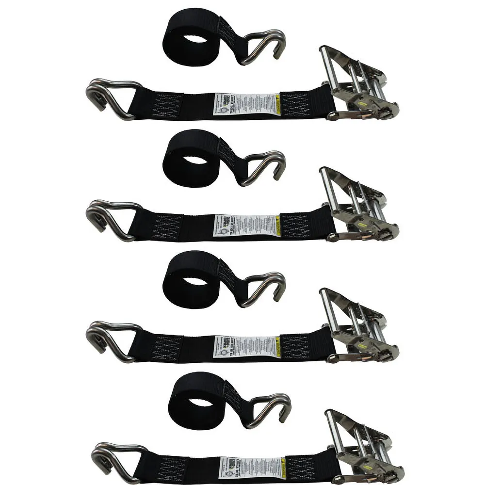 2" x 6' Stainless Steel Ratchet Strap w/Protective Sleeve, Stainless Steel Hooks, 4-Pack - Black