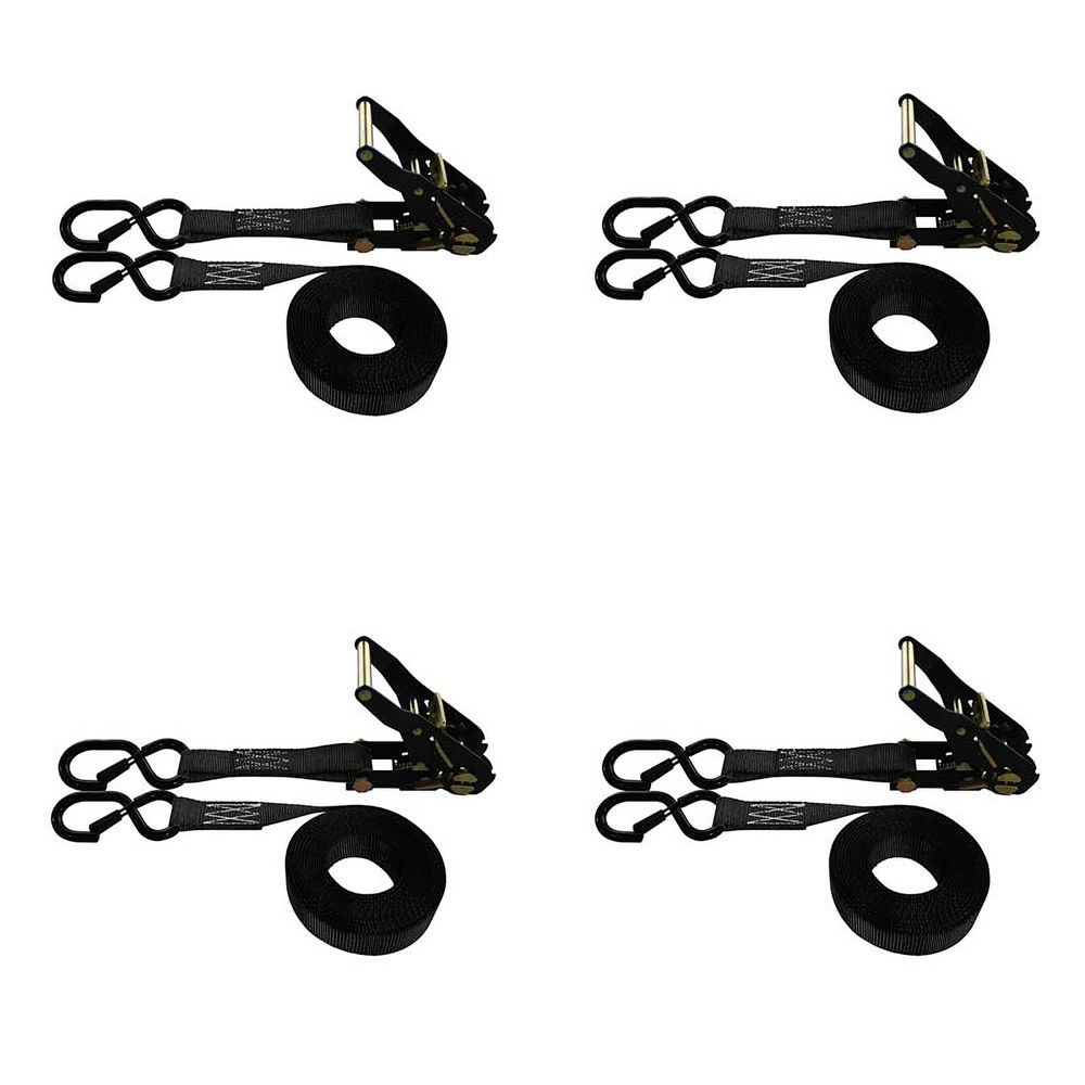 1" x 8' Ratchet Strap With Black Ratchet and S-Hooks With Keeper, 4 Pack - Black