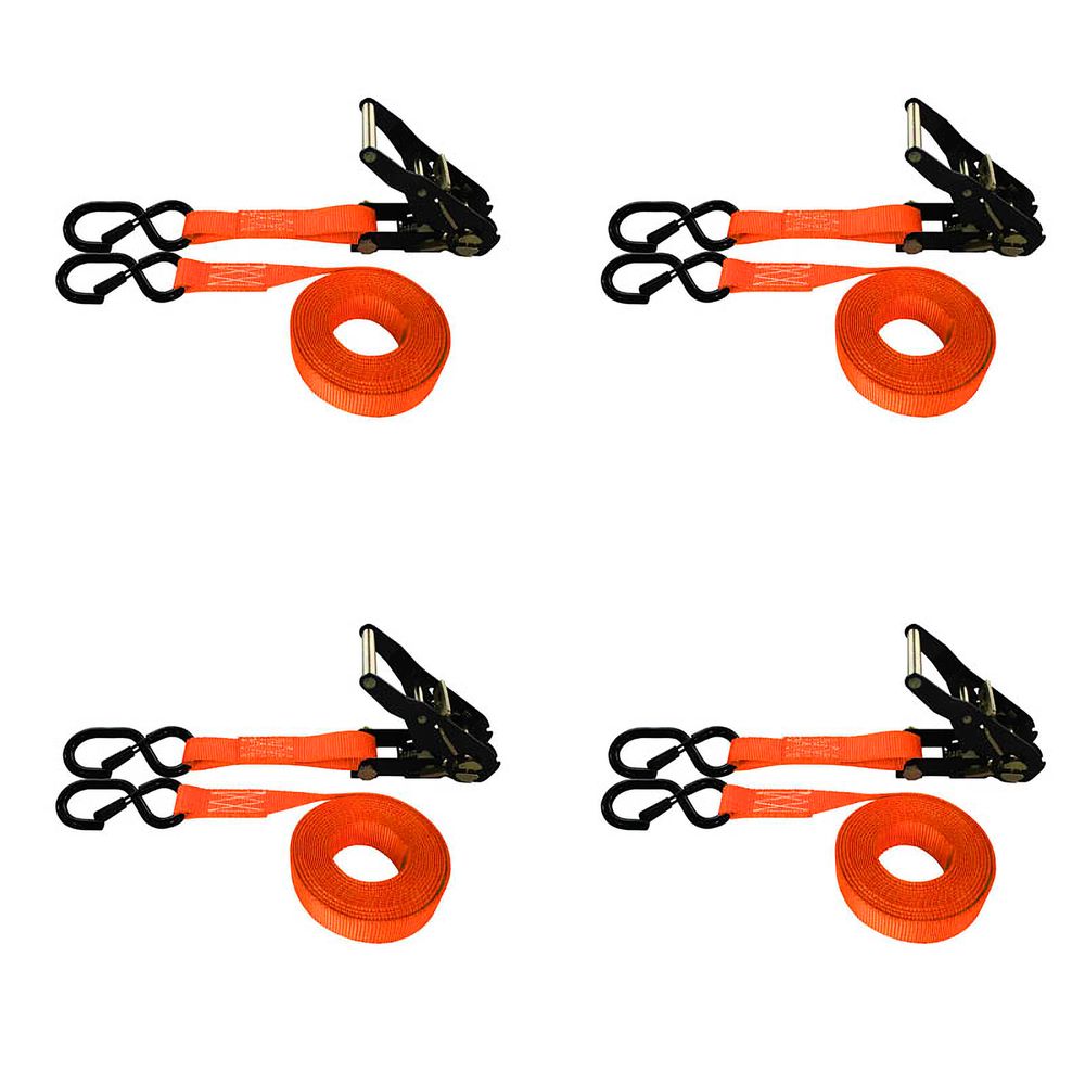 1" x 12' Ratchet Strap With Black Ratchet and S-Hooks With Keeper, 4 Pack - Orange