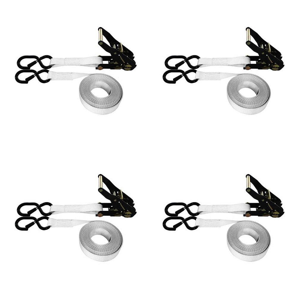 1" x 14' Ratchet Strap With Black Ratchet and S-Hooks With Keeper, 4 Pack - White