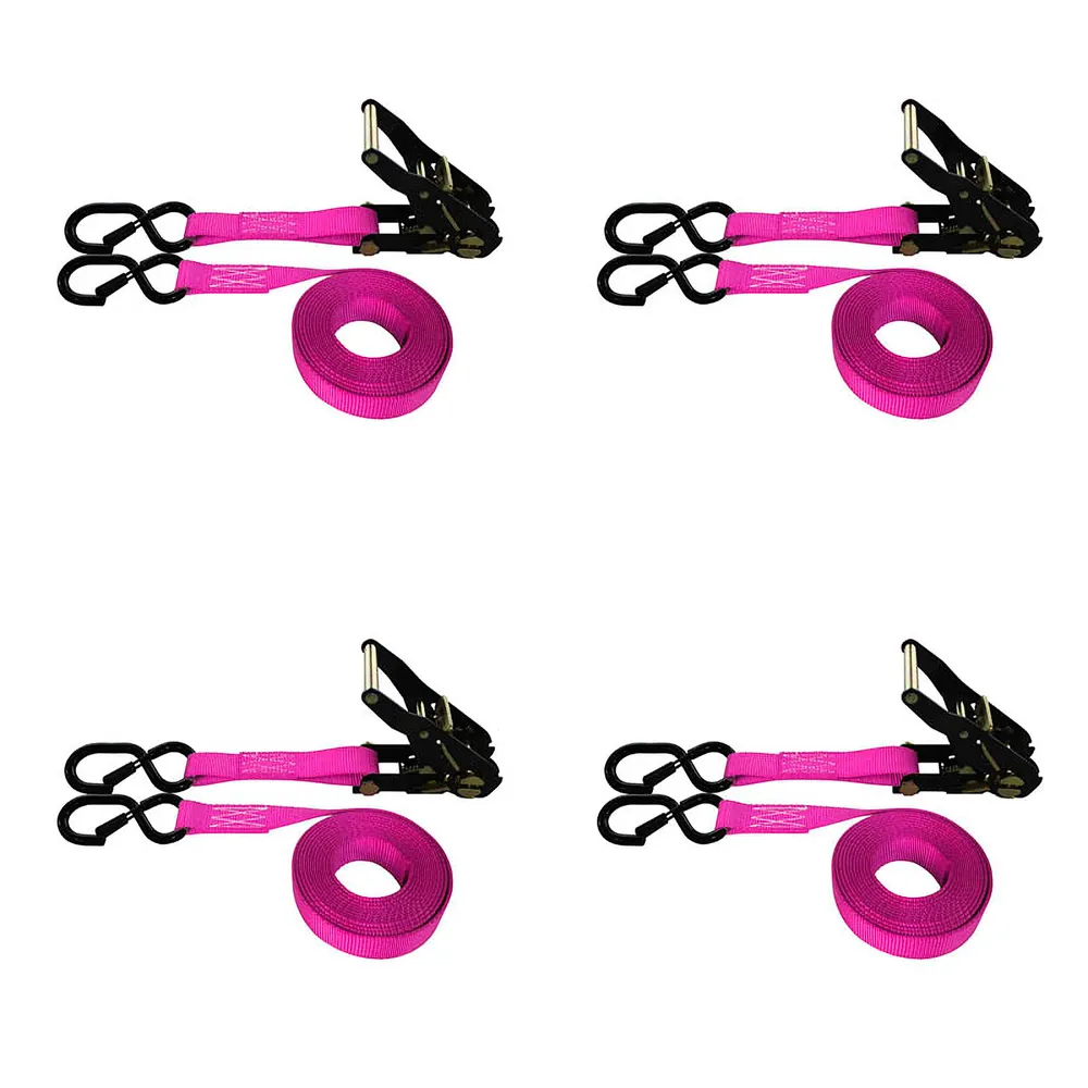1" x 14' Ratchet Strap With Black Ratchet and S-Hooks With Keeper, 4-Pack - Pink