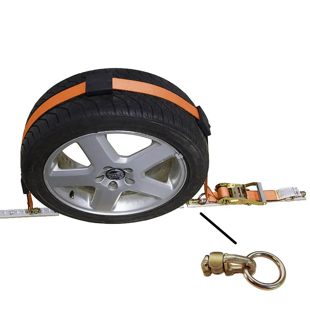 This 2" wide auto strap uses three L-track fittings for use with L-track systems, including an L-track idler to allow the webbing to pass through unempeded while tightening the strap. The #804 standard ratchet has a 6" fixed end.