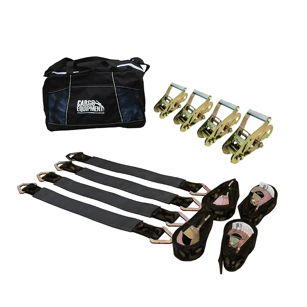 This ultimate auto hauler kit includes four 2" direct hook 10HK ratchet straps with twisted snap hooks, four 2" x 18" axle straps with delta rings and protective sleeve, plus a durable strap bag to store the kit. The twisted snap hook is sourced for its strength and durability.