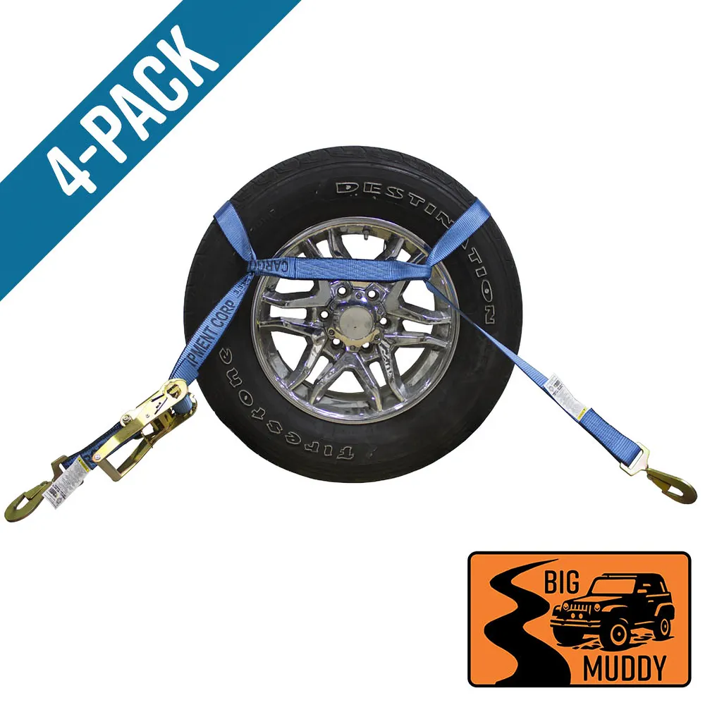 - 4 Pack of 10' Big Muddy ratchet straps with twisted snap hooks for oversized tires