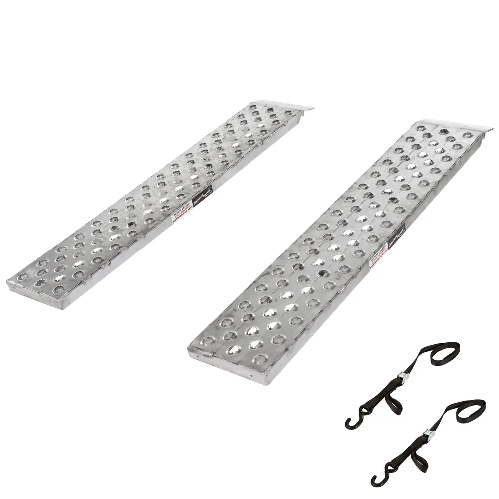 Load and haul cars, trucks and equipment onto trailers with this pair of lightweight 5' L aluminum truck trailer ramps that feature a hook/plate hybrid end and a stub foot with EZ punch plate surface traction.