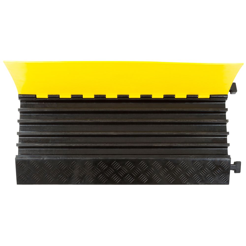 Our five-channel heavy-duty Guardian rubber cable protector keeps up to five cables, hoses, or wires protected from vehicle traffic. The cable protector has four channels that can accommodate cords with outside diameters up to 1-1/2" and a larger center channel to accommodate hoses and cables up to 1-5/8" in diameter. The protector features a commercial-grade rubber base with a hinged PVC lid, allowing it to support up to 18,000 lbs per axle. Center sections and optional turn sections (four turn sections are required to make a 90 deg. turn) are joined together with male and female connectors on either side, making it ideal for curving around warehouse racking, large poles, or other objects. The surface has a diamond pattern tread for enhanced traction. The yellow flip-up lid is easily visible, and has molded in safety warnings.