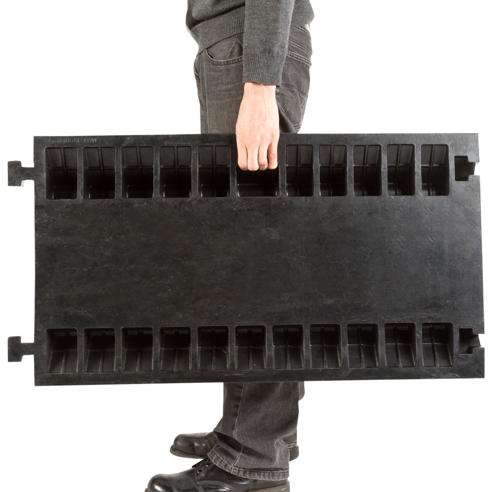 Our commercial-grade rubber Guardian cable ramp protects up to three cables, hoses, or wires from damage caused by heavy vehicle and industrial traffic. This cable protector has three channels that can accommodate cords measuring up to 2-1/2" in outside diameter. The ramp features a commercial-grade rubber base with a hinged PVC lid, allowing it to support up to 24,000 lbs per axle. Connect multiple Guardian cable ramps together using the interlocking male and female T-connectors to cover long cable runs. A diamond tread pattern on the surface of the ramp provides enhanced traction for vehicle and pedestrian traffic.