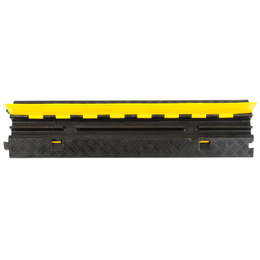 Our dual-channel Guardian cable ramp was designed specifically to protect wires and cables from being damaged by forklifts and other vehicles weighing up to 12,000 lbs per axle. Interlocking trapezoid connectors at each end of the cable protector link multiple ramps together to cover greater lengths of cable. This heavy-duty cable protector features a smooth 28 deg. incline for a gradual approach angle and two channels for running 1-1/8" diameter cables through. There are also four integrated safety reflectors and two 2" wide channel gaps for crossing cables from one channel to the other, if necessary.