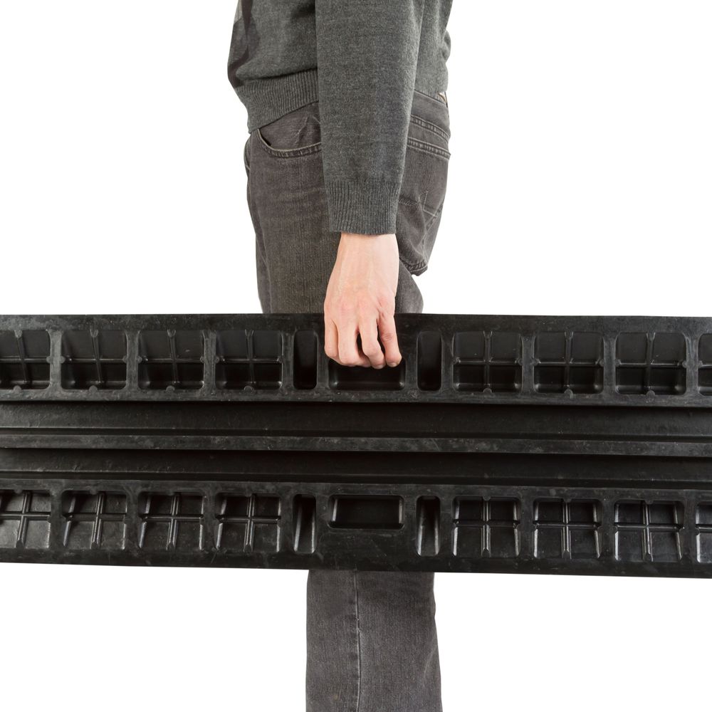 The Guardian drop-over cord protector is designed to protect cables from damage and prevent people from tripping over exposed cables. The floor cable concealer is manufactured from heavy-duty rubber and features a skid-resistant, high-traction surface. The interlocking T-connectors allow multiple pieces to be linked together to cover long cable runs. This cable ramp measures 3' 3-5/8" L x 12" W x 1-7/8" H and it supports up to 4,000 lbs. per axle.
