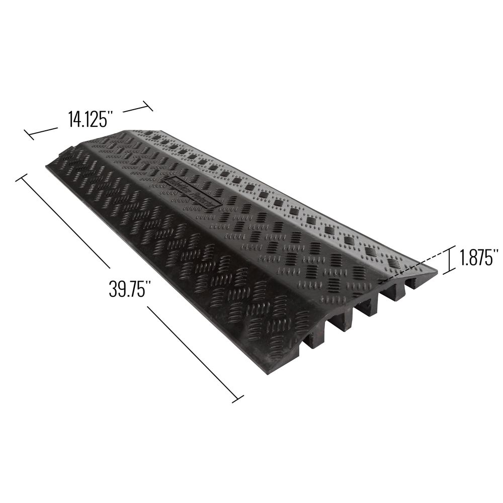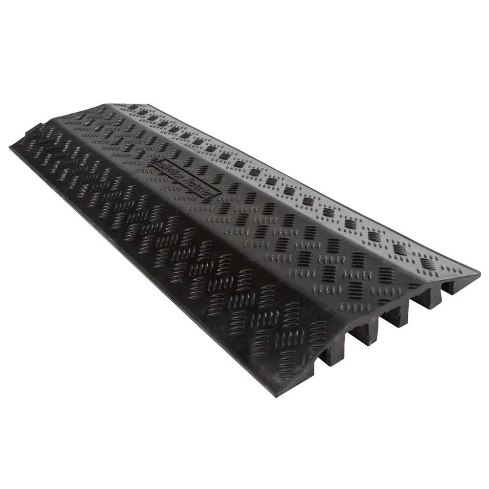The cable hose protector is constructed from heavy-duty, commercial grade rubber to protect and organize hoses and cables. This drop over cable protector is designed to use in applications at home, around the office, and in commercial settings. This cord protector features three channels to protect cables or cords up to 1.375" in diameter. The cable hose protector is designed to save cables and cords from damage caused by vehicles and pedestrian traffic and includes a high traction, skid-resistant surface. The modular design and interlocking T-connectors allow multiple cable ramps to be connected together to cover long cable runs. Drop over protectors do NOT prevent cable wear from below.
