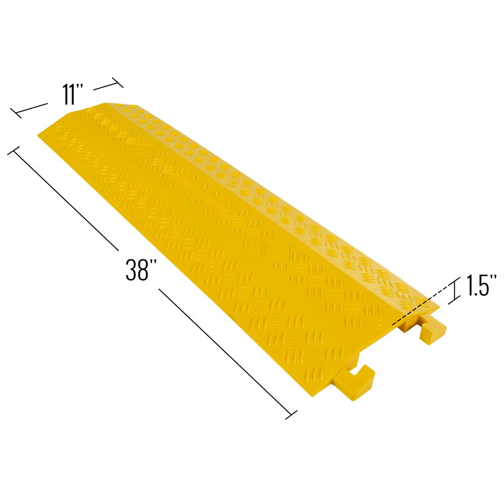 Safely protect pedestrians and important cables in high traffic areas with this industrial cable cover. The high visibility yellow cable cover helps prevent pedestrians from accidentally tripping over loose cables, and is strong enough to protect cables from lightweight hand trucks and carts. It is perfect for use in warehouses, indoor work sites, flea markets, the garage, entertainment venues, shopping malls, the office, festivals, marinas, and much more. This cable ramp measures 38" L x 11" W x 1.5" H with a 4" W x 1" H cable channel, and it supports up to 2,000 lbs per axle. An interlocking L-connector design allows multiple cable covers to be connected together to cover a larger area.