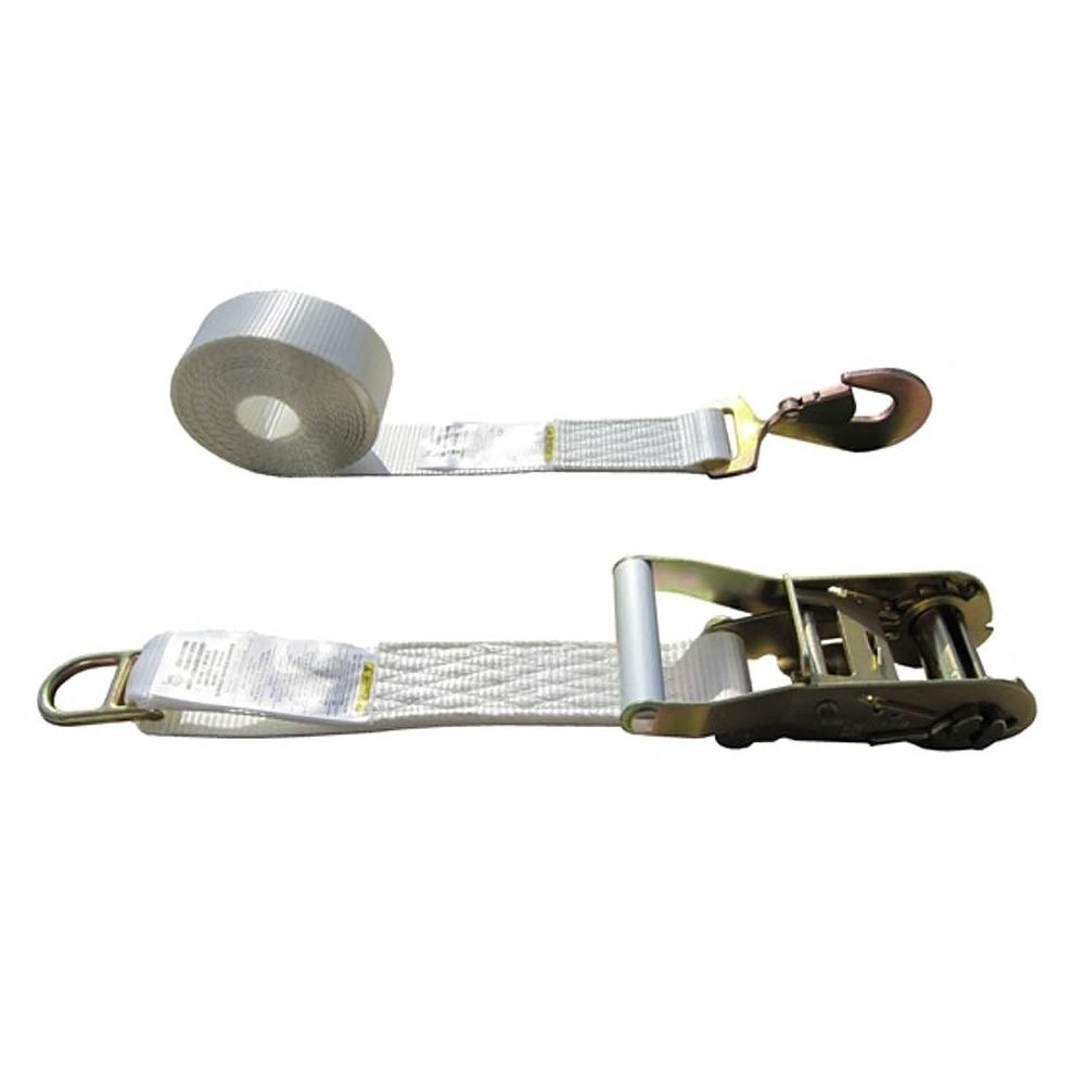 2" x 20' Tent Ratchet Strap, Double Bar D-Ring and Twisted Snap Hook - White