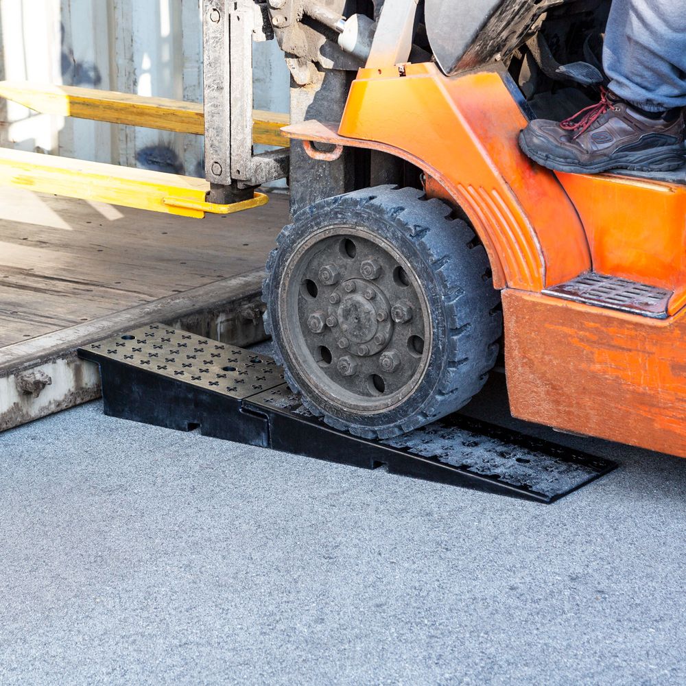 - Durable molded rubber ramps work with shipping containers that have a 6" tall lip