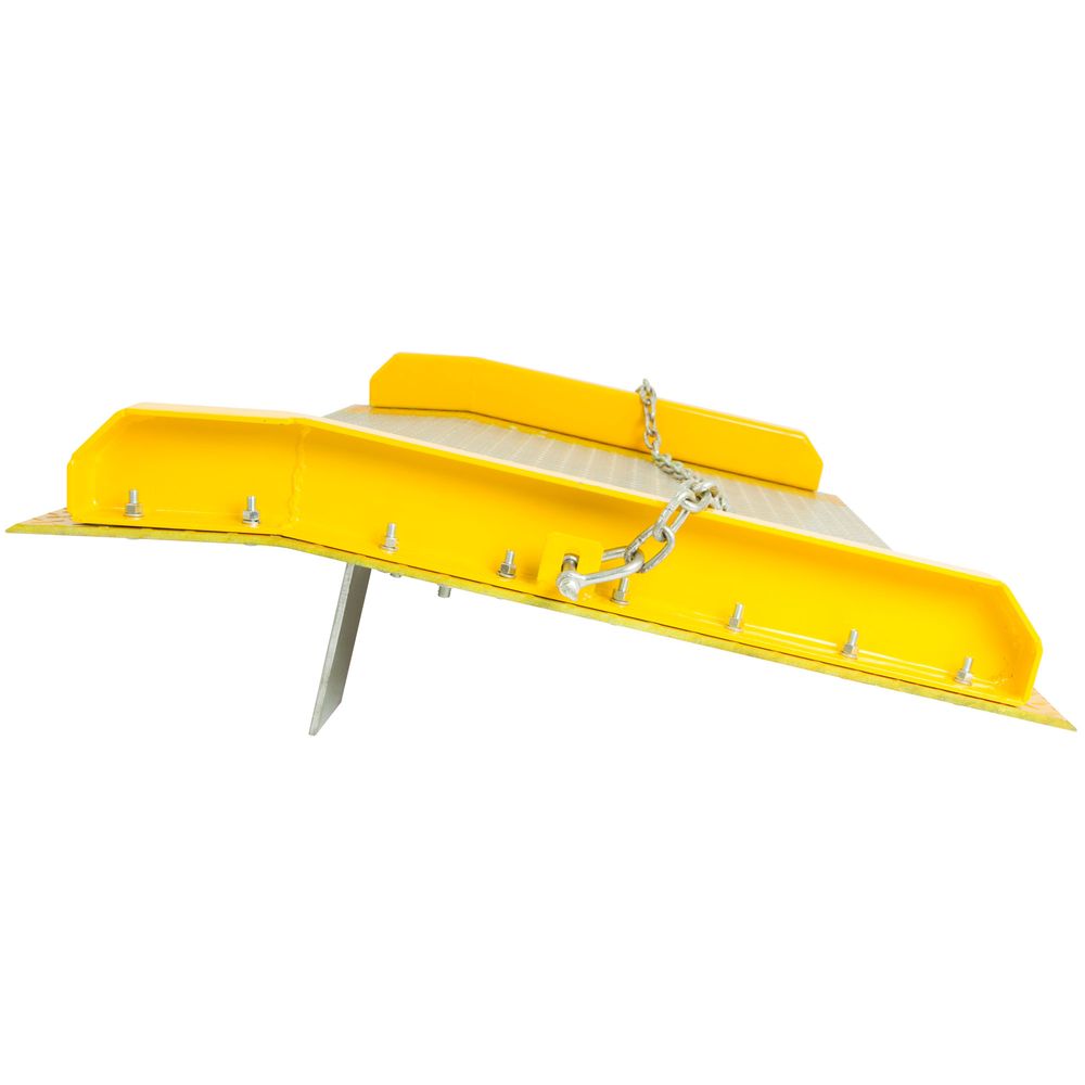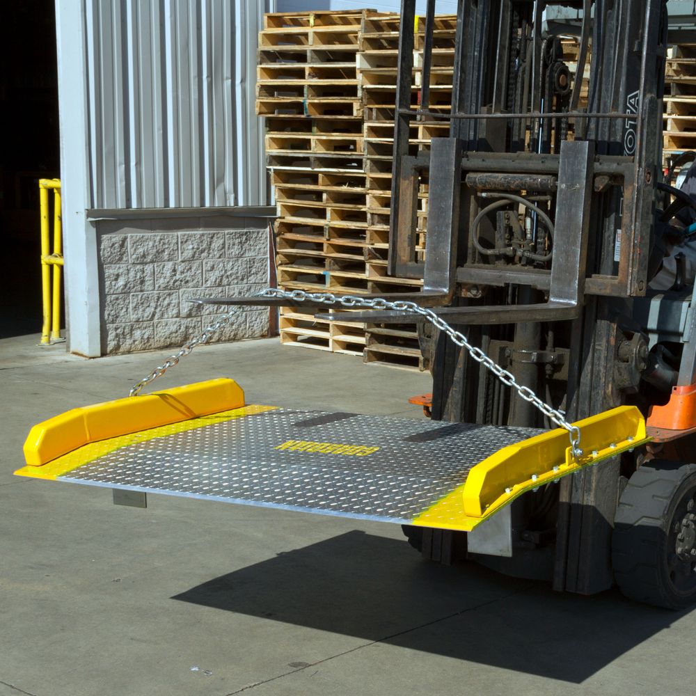 Loading operations will be safer and easier with this heavy-duty aluminum dock board. Each dock bridge is made with heavy duty, rust proof aluminum, and features a raised diamond tread surface for traction. Structural steel curbs on each end of the aluminum dock board prevents equipment runoff, and are painted yellow for greater visibility. The dock bridge has steel safety legs, which are bolted to the deck for greater durability, to help keep them in place. The edges of the dock board are beveled to protect equipment tires and create a smooth transition from loading dock to bridge to trailer.