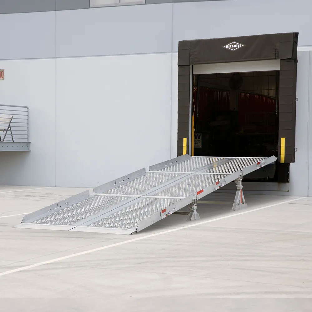 Set up loading and unloading access for box trucks in minutes with this portable aluminum yard ramp system; no loading dock required. Designed to be set up by two people in less than 15 minutes without any tools, this modular system consists of six ramps and two adjustable height support stands.
