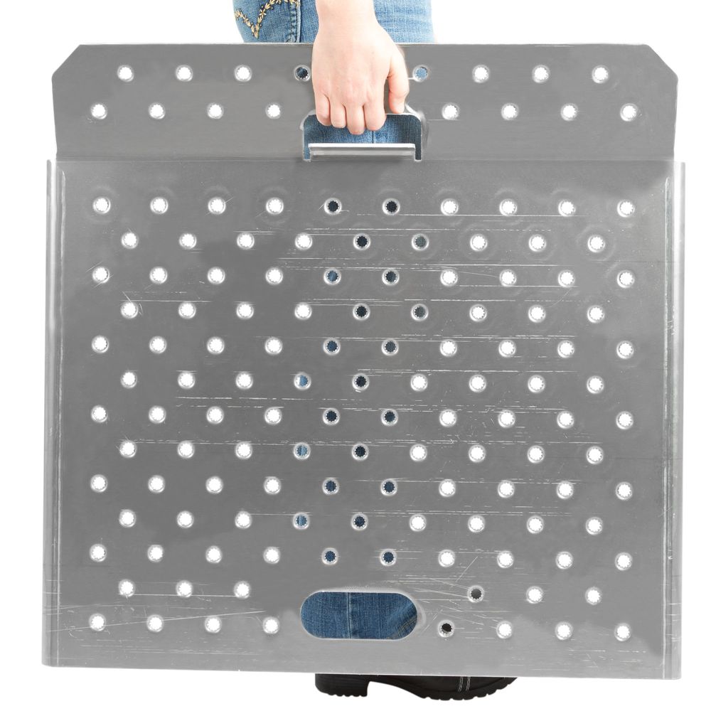 These portable, lightweight, Guardian Aluminum Curb Ramps offer superior traction utilizing a punch plate design that prevents rain, mud, or snow build-up. Manufactured from lightweight, high-strength, military grade aluminum, these ramps won't rust or corrode. The built-in handles make them easy to pick up and move to wherever they're needed, while the handle in the lip of the ramp features a vertical stop, ensuring the ramp stays in place when it's in use. Available in 20" wide and 20" long.