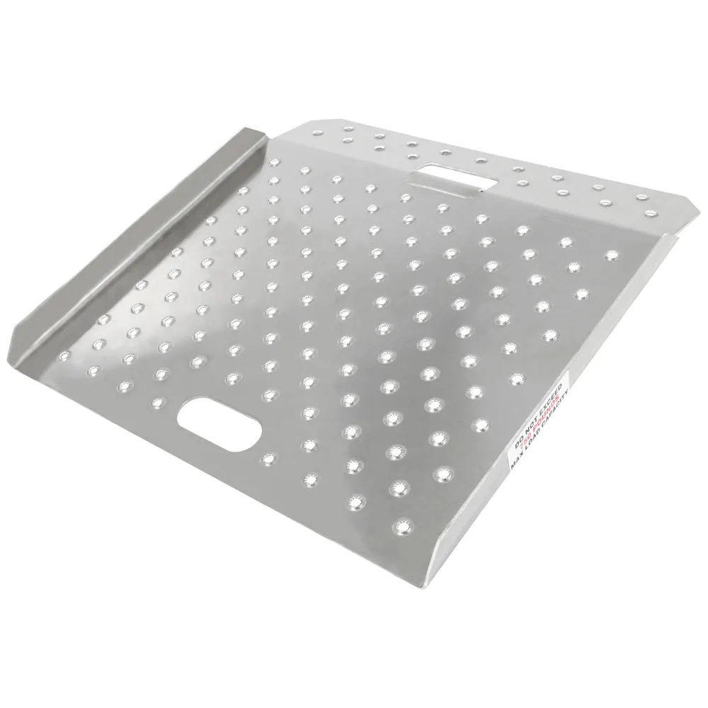 These portable, lightweight, Guardian Aluminum Curb Ramps offer superior traction utilizing a punch plate design that prevents rain, mud, or snow build-up. Manufactured from lightweight, high-strength, military grade aluminum, these ramps won't rust or corrode. The built-in handles make them easy to pick up and move to wherever they're needed, while the handle in the lip of the ramp features a vertical stop, ensuring the ramp stays in place when it's in use. Available in 36" wide and 36" long.
