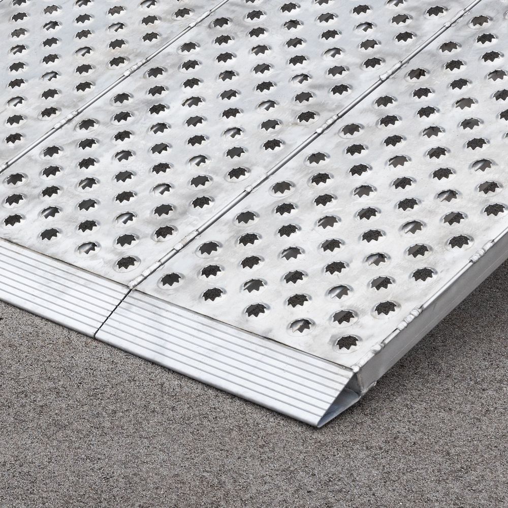 Made in the USA of strong, lightweight aluminum, the ramp system features exclusive EZ Traction punch plate for superior non-slip grip in all weather conditions. The tapered knife foot and deep-lipped top plate create a smooth transition on and off the ramp. The three ramp sections are securely connected so they move as a single unit. The entire ramp system supports 3,000 lb. per axle.