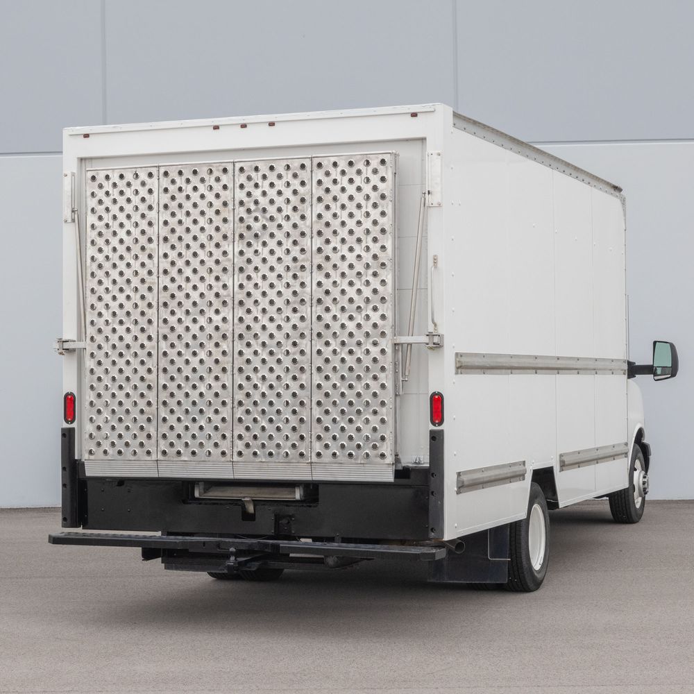 The adjustable compression gas shocks offer more safety than traditional extension springs and can be adjusted easily to increase or reduce the effort required to raise and lower the ramps. Once raised, the ramps latch securely to the box truck with rust-resistant aluminum latch brackets and stainless steel keepers. The latches can be locked if desired (padlock not included) for additional security.