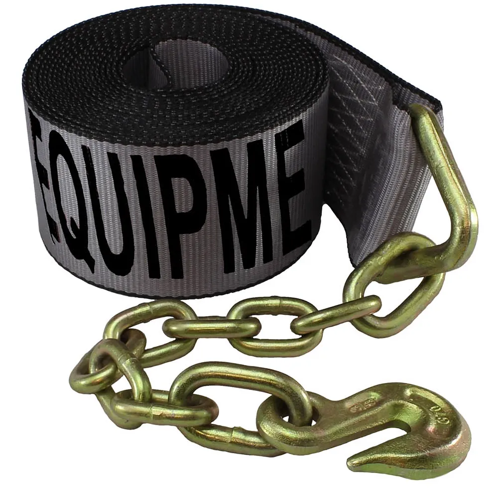 Custom 4" winch straps with chain end are built using our #888-4 20,000 lb webbing and heavy-duty chain end with delta ring. Our winch straps meet all current North American cargo control standards for tie-down straps, including US DOT, FMCSA, CHIP, Canada NSC Standard 10, and WSTDA T-4. As a certified testing facility, all our straps are guaranteed to be strong and durable. Straps should be inspected per WSTDA guidelines and taken out of service immediately if any sort of damage is discovered. Working Load Limit: 5,400 lbs Breaking Strength: 16,200 lbs