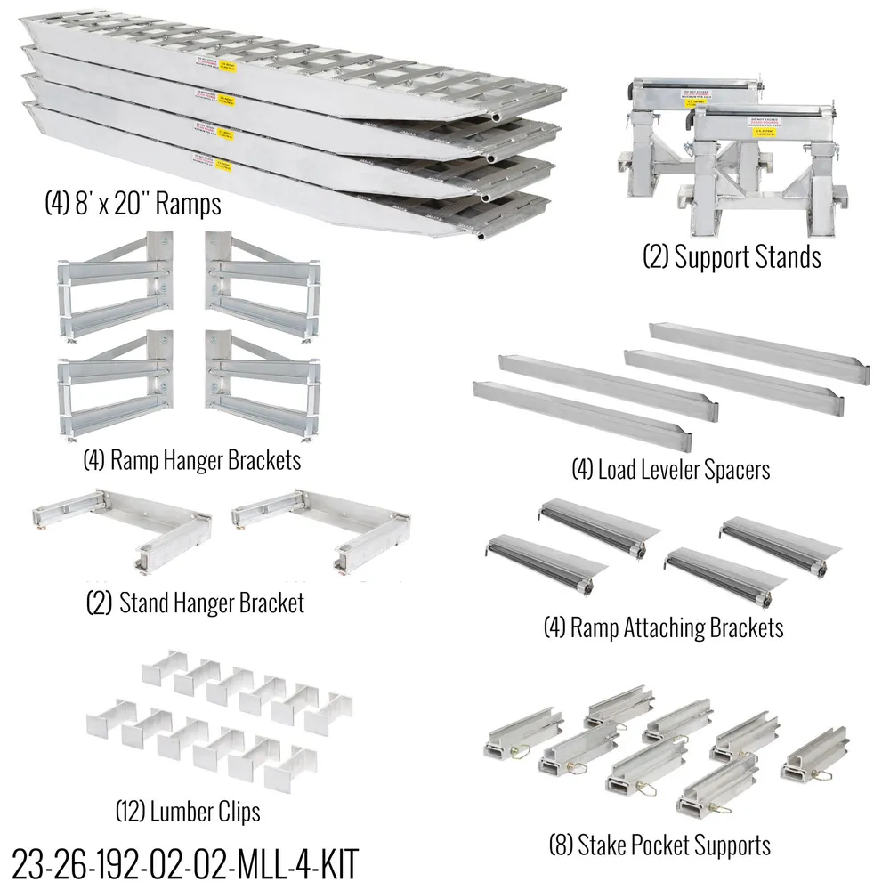 - This system includes: four 8' ramps, two support stands, four load leveler spacers, 12 lumber clips, eight stake pocket supports, four ramp hanger brackets, two stand hanger brackets and four ramp attaching brackets