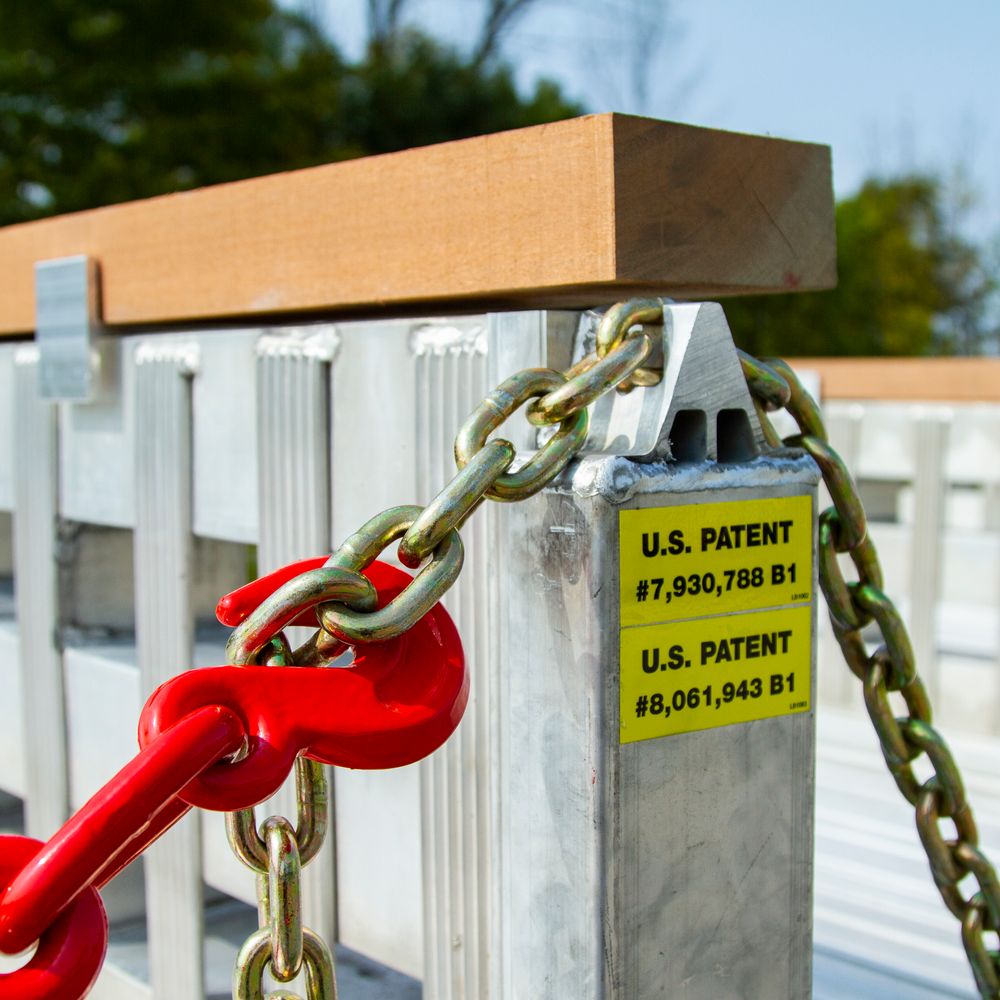 The cast chain slot on the top of the stakes allows them to be secured to the trailer with a 3/8" chain and load binders (all sold separately). These standard stakes fit 3-3/8" x 1-5/16" stake pockets and have an easy width adjustment to accommodate all 102" wide trailers. US Patent #7930788.
