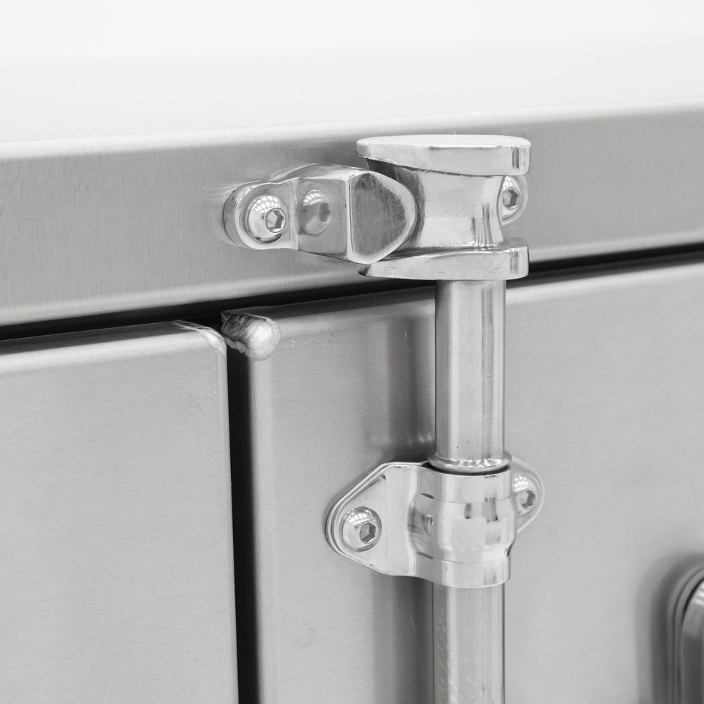 The cam locking mechanism is located on the right side facing, and can fit a padlock (not included) to prevent unauthorized access.